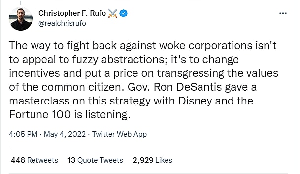 Rufo announced the campaign on Twitter writing, “Disney wants to impose critical race theory and gender ideology on American families. We’re organizing a campaign to fight back.”