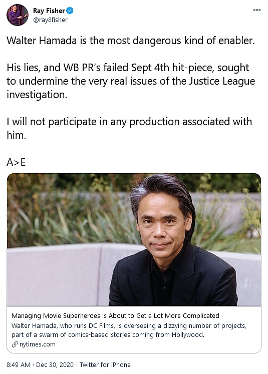 Fisher, in the latest chapter of his crusade against WB and those he alleged wronged him during the Joss Whedon-led reshoots of Justice League, took to Twitter to share the recent New York Times article focusing on Hamada and DC’s cinematic future and accuse the studio executive of being a liar and “the most dangerous kind of enabler.”