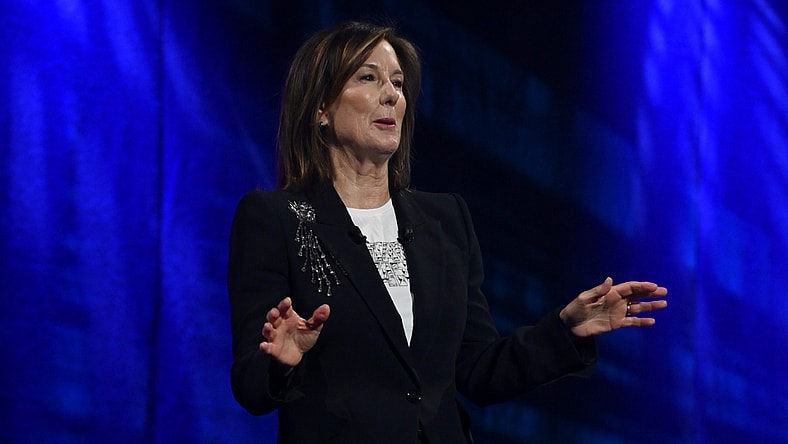LONDON, ENGLAND - APRIL 07: Host Kathleen Kennedy walks onstage during the studio panel at Star Wars Celebration 2023 in London at ExCel on April 07, 2023 in London, England. (Photo by Kate Green/Getty Images for Disney)