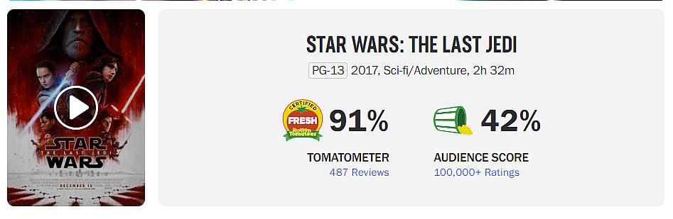 The biggest black eye is the Rian Johnson directed The Last Jedi. The film has a poor 6.9 weighted average on IMDb. It has an even more abysmal 42% Audience Score on Rotten Tomatoes with moviegoers rating the film an average of 2.6 out of 5.