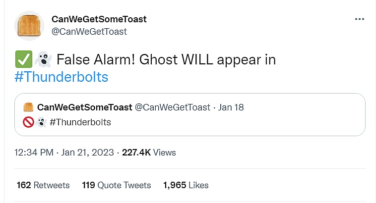 However, three days later, the user claimed it was a “false alarm” and that “Ghost WILL appear in Thunderbolts.”