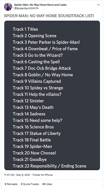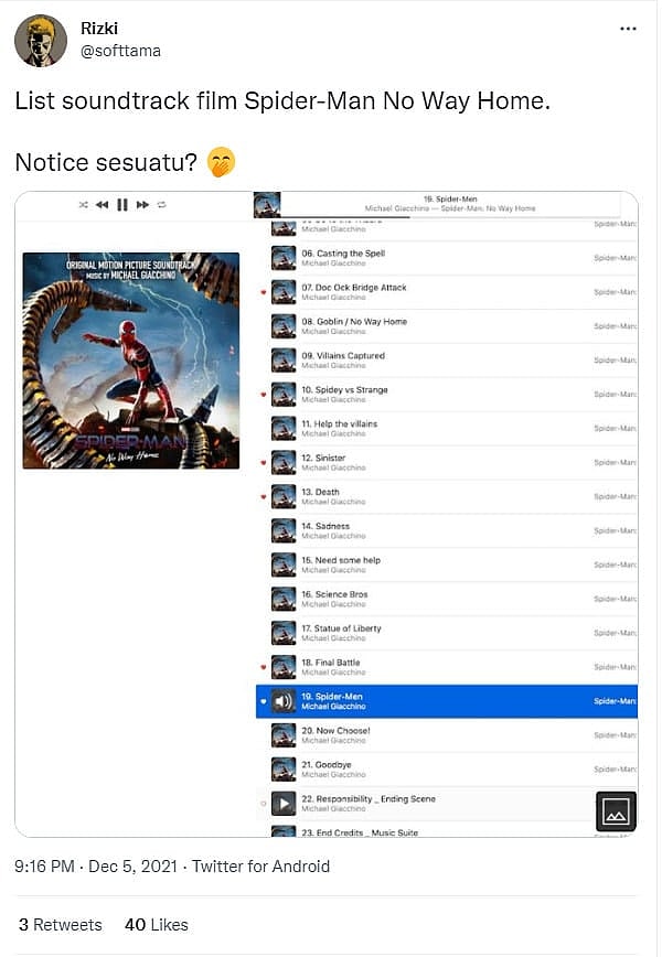 The alleged soundtrack list was leaked to Twitter by user Softtama, who wrote, “List soundtrack film Spider-Man No Way Home. Notice sesuatu?”