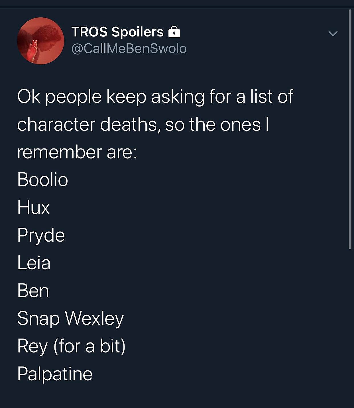 Twitter user @CallMeBenSwolo took to Twitter after allegedly seeing The Rise of Skywalker to reveal all of the characters who died in the film.