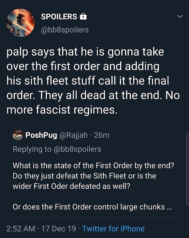 It’s also unclear how Snap Wexley will die. My best guess would be that he dies during the naval battle in the skies and space above Exogol.