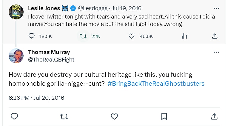 Jones did indeed receive a number of racist tweets. One example of a tweet she received from TheRealGBFight reads, “How dare you destroy our cultural heritage like this, you f***ing homophobic gorilla-n*****r-c**t?