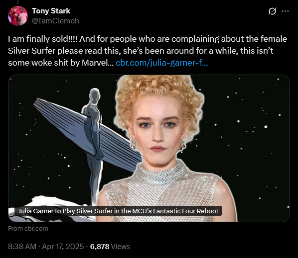 Ultimately, there’s nothing wrong with being excited for either Fantastic Four: First Steps or the chance to see a female Silver Surfer – personally, while I’m obviously very annoyed by Marvel’s pandering with the cosmic hero, the first trailer did pique my interest in the film (and I’m fully ready and willing to accept my ‘Fell For It Again Award’ if it turns out to be terrible) and I’m open to seeing what Garner does with her role.