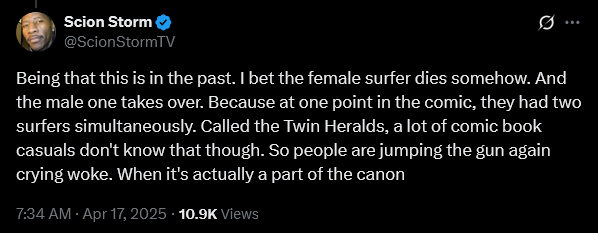 “Because at one point in the comic, they had two surfers simultaneously. Called the Twin Heralds, a lot of comic book casuals don’t know that though. So people are jumping the gun again crying woke. When it’s actually a part of the canon”