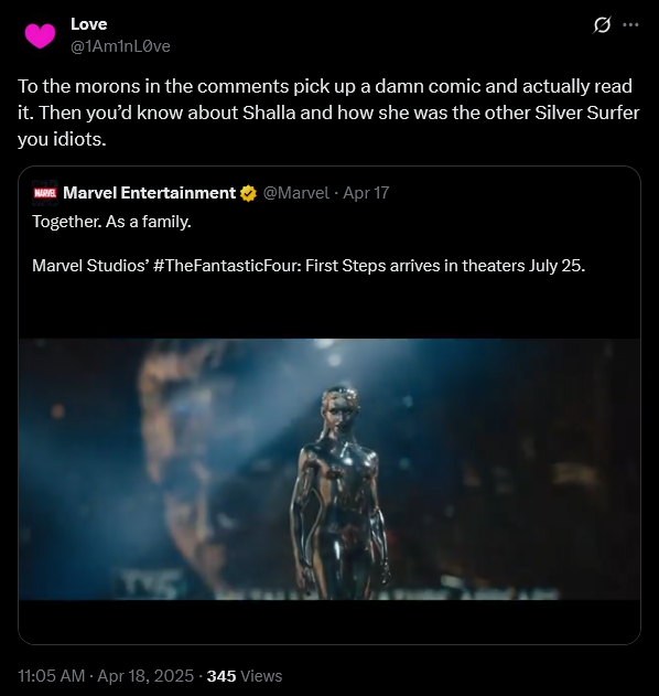 “To the morons in the comments pick up a damn comic and actually read it. Then you’d know about Shalla and how she was the other Silver Surfer you idiots.”