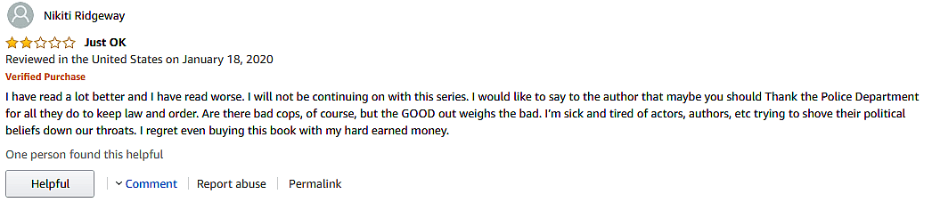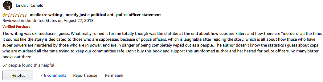 “It sounds like the story is dedicated to those who are suppressed because of police officers, which is laughable after reading the story,” wrote customer Linda J. Cofield. “Don’t buy this book and support this uninformed author and her hatred for police officers.”