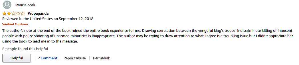 Another user, Francis Zeak, described the book as “propaganda.” Zeak also asserted, “Drawing correlation between the vengeful king’s troops’ indiscriminate killing of innocent people with police shooting of unarmed minorities is inappropriate.”