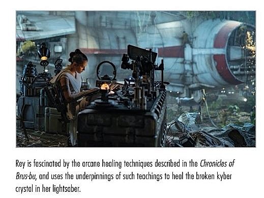 The Visual Dictionary explains, “Rey is fascinated by the arcane healing techniques described in the Chronicles of Brus-bu, and uses the underpinnings of such teachings to heal the broken kyber crystal in her lightsaber.”