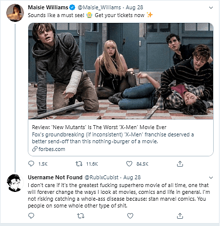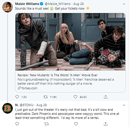Recently, Maisie Williams, who plays Rahne Sinclair a.k.a. Wolfsbane in the film, took to Twitter to promote the film. But it was in light of a recent article published by Forbes. Writer Scott Mendelson titled the Review as “‘New Mutants’ Is The Worst ‘X-Men’ Movie Ever”.