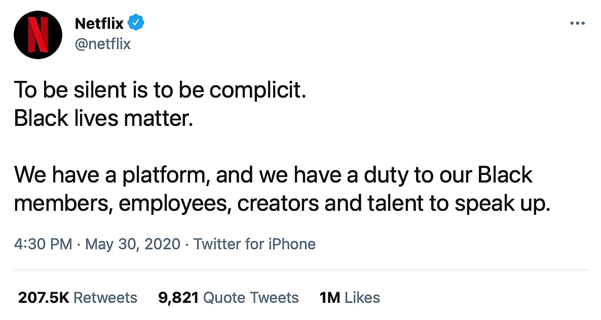 “Black lives matter. We have a platform, and we have a duty to our Black members, employees, creators and talent to speak up,” reads the statement shared on Netflix’s official Twitter account.