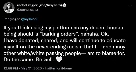 Zegler admitted she was a racist back in May 2020 when she tweeted, “If you think using my platform as any decent human being should is ‘barking orders’, hahaha. Ok. I have donated, shared, and will continue to educate myself on the never ending racism that I— and many other white/white passing people— am to blame for. Do the same. Be well.”