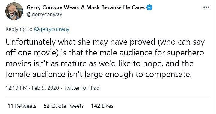 He would later write, “Unfortunately what she may have proved (who can say off one movie) is that the male audience for superhero movies isn’t as mature as we’d like to hope, and the female audience isn’t large enough to compensate.”