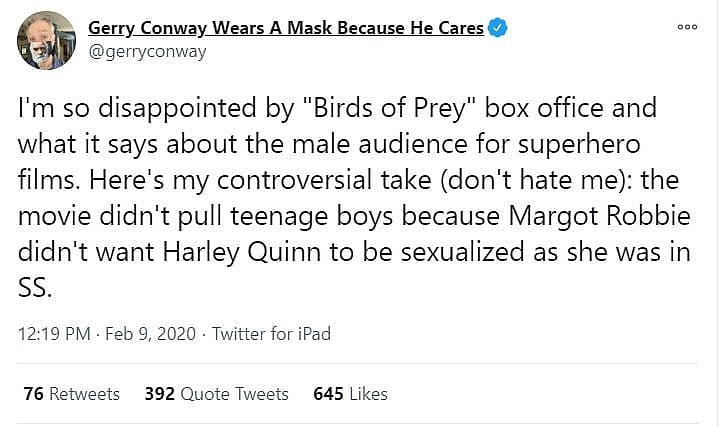 Conway wrote on Twitter, “I’m so disappointed by ‘Birds of Prey’ box office and what it says about the male audience for superhero films. Here’s my controversial take (don’t hate me): the movie didn’t pull teenage boys because Margot Robbie didn’t want Harley Quinn to be sexualized as she was in SS.”