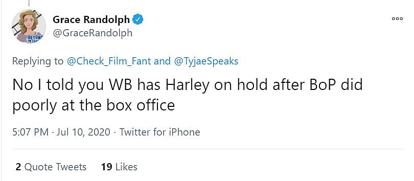 Scooper Grace Randolph would also report that “WB has Harley on hold after BoP did poorly at the box office.”