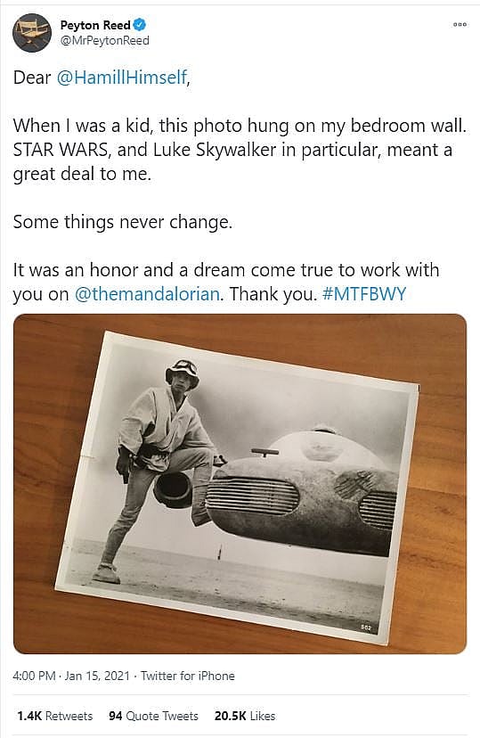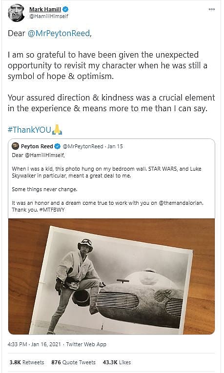 Hamill’s comments came after The Mandalorian director Peyton Reed thanked Mark Hamill for working with him.