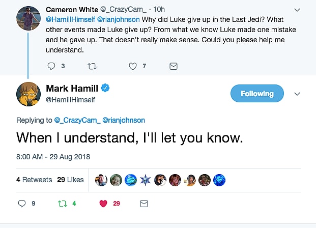 In August 2018, Hamill made clear he did not understand why Luke had given up in The Last Jedi.