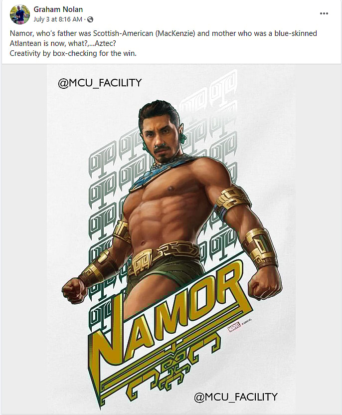 “Namor, whose father was Scottish-American (MacKenzie) and mother who was a blue-skinned Atlantean is now, what? Aztec?” questioned Nolan, before sarcastically appraising, “creativity by box-checking for the win.”