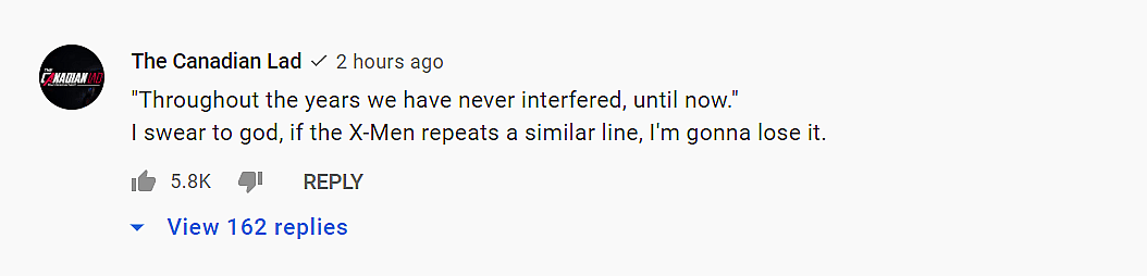 The Canadian Lad wrote, “‘Throughout the years we have never interfered, until now.’ I swear to god, if the X-Men repeats a similar line, I’m gonna lose it.”