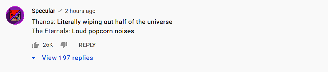 Specular wrote, “Thanos: Literally wiping out half of the universe. The Eternals: Loud popcorn noises.”