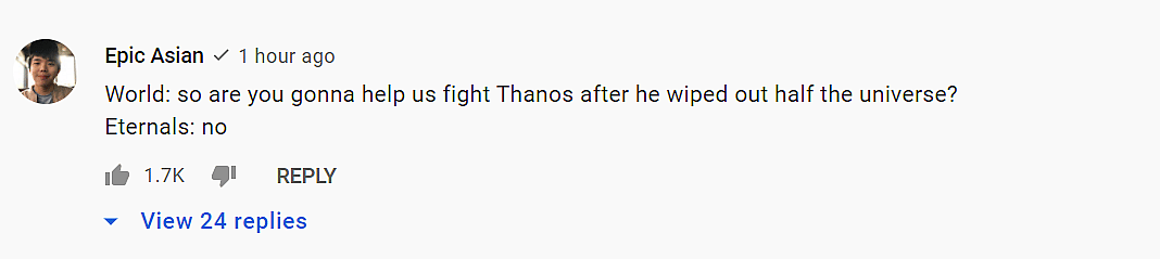 Epic Asian wrote, “World: so are you gonna help us fight Thanos after he wiped out half the universe? Eternals: no.”