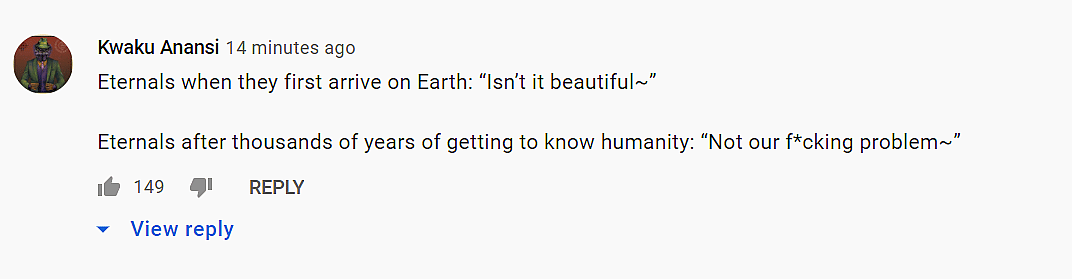 Kwaku Anansi wrote, “Eternals when they first arrive on Earth: ‘Isn’t it beautiful~’ Eternals after thousands of years of getting to know humanity: ‘Not our f***ing problem~'”
