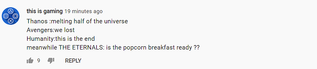 This is gaming added, “Thanos: melting half of the universe. Avengers: we lost. Humanity: this is the end. meanwhile THE ETERNALS: is the popcorn breakfast ready ??”