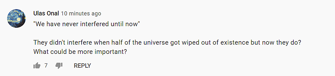 Ulas Onal wrote, “‘We have never interfered until now.’ They didn’t interfere when half of the universe got wiped out of existence but now they do? What could be more important?”