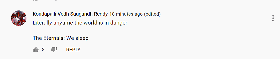 Kondapalli Vedh Saugandh Reddy wrote, “Literally anytime the world is in danger. The Eternals: We sleep.”
