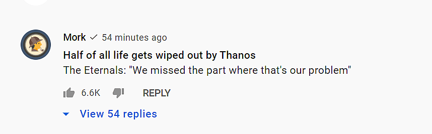 In the comments of the movie’s trailer on the official Marvel Entertainment page Mork wrote, “Half of all life gets wiped out by Thanos. The Eternals: “We missed the part where that’s our problem.”