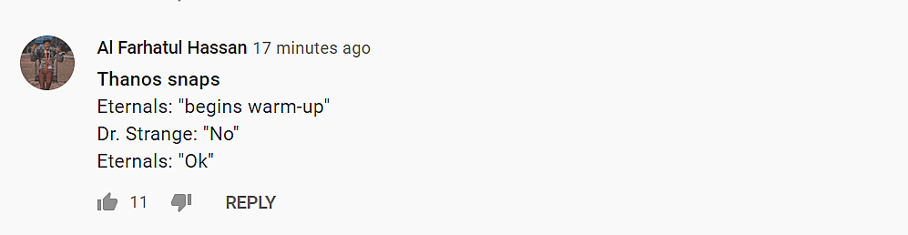 Al Farhatul Hassan wrote, “Thanos snaps. Eternals: ‘begins warm-up’ Dr. Strange: ‘No.’ Eternals: ‘Ok.'”