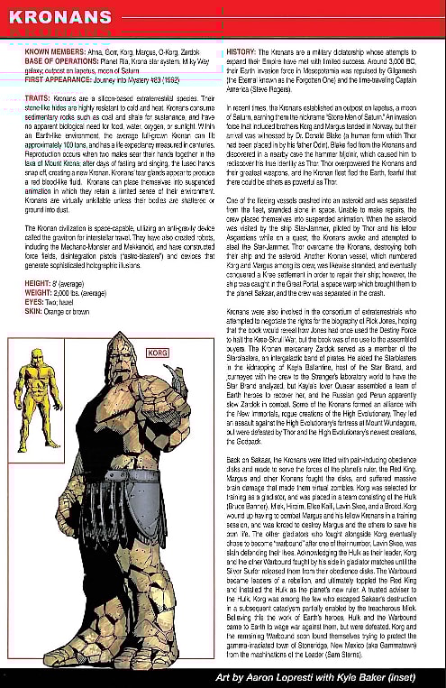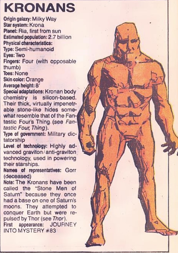 This entry does add a note that reads, “The Kronans have been called the ‘Stone Men of Saturn’ because they once had a base on one of Saturn’s moons. They attempted to conquer Earth but were repulsed by Thor (see Thor).”