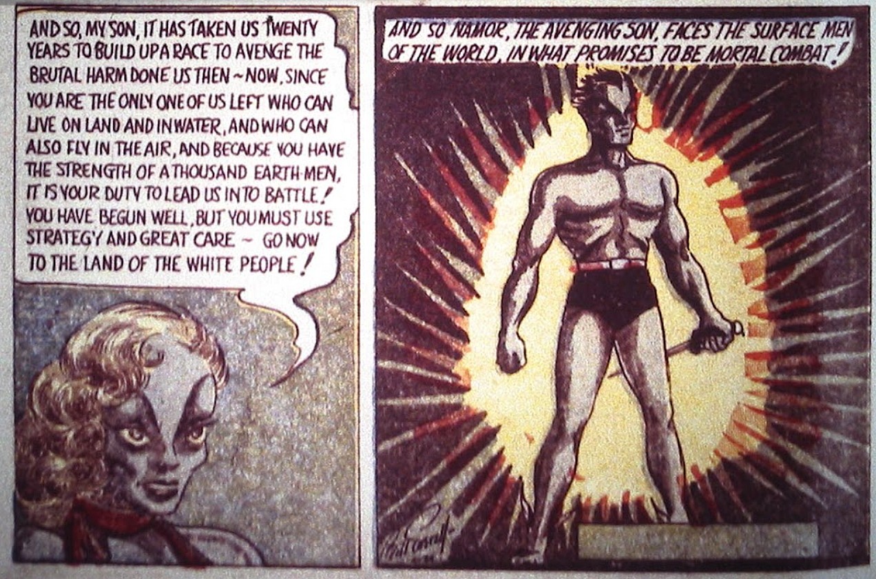 As you can see below, the panel reads, “And so Namor, the Avenging Son, faces the surface men of the world, in what promises to be mortal combat!”