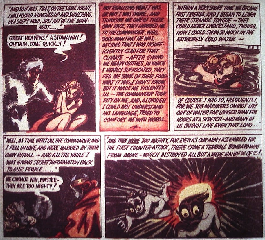 Princess Fen tells Namor, “Well, as time went on, the commander and I fell in love, and were married by their own ritual ~ and all the while I was giving secret information back to our people…..”