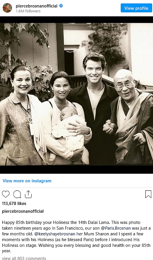“This was photo taken nineteen years ago in San Francisco, our son @Paris.Brosnan was just a few months old,” he recallled. “@keelyshayebrosnan her Mum Sharon and I spent a few moments with his Holiness (as he blessed Paris) before I introduced His Holiness on stage. Wishing you every blessing and good health on your 85th year.”