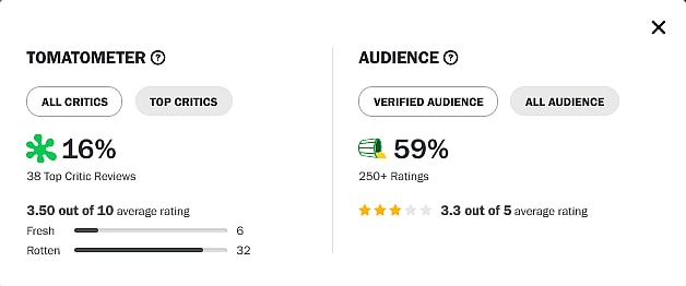 Among Top Critics, this rating sinks to an even lower 16%, this time with only 6 fresh ratings across 38 critics and averaging out to a score of 3.5/10.
