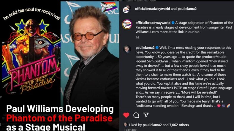 “Well, I’m a mess reading your responses to this news,” Williams said, in a response to an Instagram post by BroadwayWorld. “You know you deserve the credit for this remarkable opportunity…. 50 years ago … to quote the producer/studio legend Sam Goldwyn … when Phantom opened ‘they stayed away in droves!’ … but a few crazy people loved it so much they showed it to all of their friends, even if they had to tie them to a chair to make them watch it… And some of those victims became enthusiasts and… Look what you did. Look what you did. You kept it alive and this time we’re actually moving forward towards POTP on stage Grateful past language and… As we say in recovery… ‘More will be revealed!’”