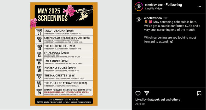 An exclusive screening with limited seats sponsored by CineFile Video is happening next Thursday. There will be two showings, one at 8:30 pm and another at 11:30 pm, for an audience of 25 people each. An RSVP window opens this Friday, the 23rd, so if you happen to live in the area, there is still time to get tickets.