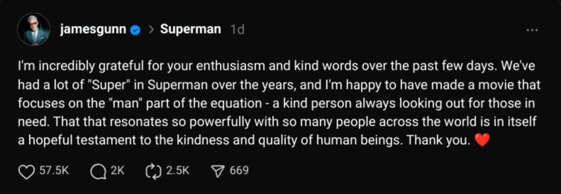 James Gunn is happy with how it’s doing, writing on Threads, “I’m incredibly grateful for your enthusiasm and kind words over the past few days. We’ve had a lot of ‘Super’ in Superman over the years, and I’m happy to have made a movie that focuses on the ‘man’ part of the equation – a kind person always looking out for those in need. That that resonates so powerfully with so many people across the world is in itself a hopeful testament to the kindness and quality of human beings. Thank you.”