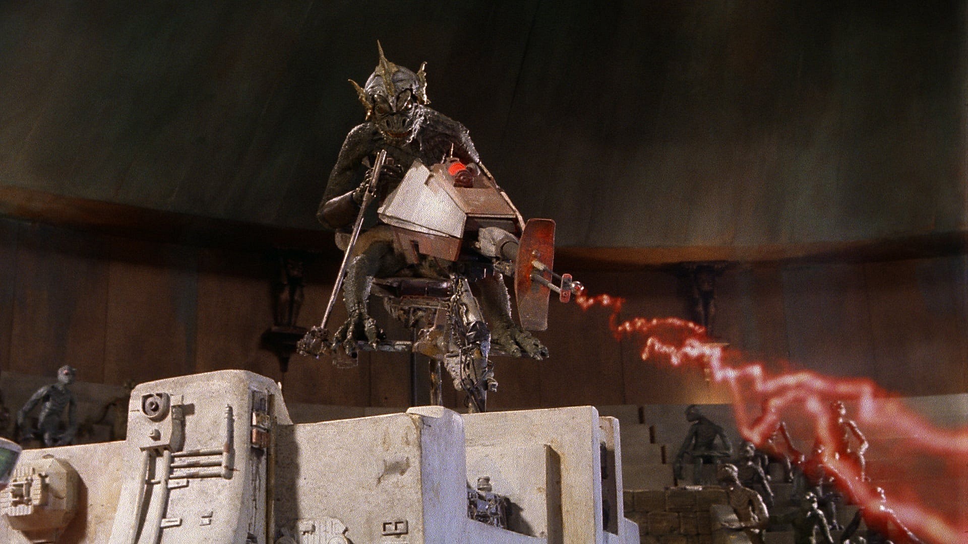 The aliens in the film have evolved over the years and now have a more snake-like appearance — resembling the look of Cobra Commander’s snake form in the animated G.I. Joe: The Movie from 1987. The surviving Yeti in the film is thrown into a gladiator arena with the human expedition surrounded by reptilian onlookers. The aliens use a giant laser shot directly into the brain of the yeti to appease it. The fight between the yeti and the snake people, as well as their slithery behavior, are the highlights of The Primevals.