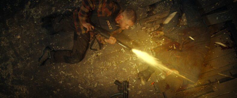 The masked men with assault rifles point their guns over Walker’s shoulder as everyone in Tsui’s hideout is torn apart by a relentless barrage of bullets in slow motion. Walker has become accustomed to rearranging a pile of blood and corpses into something somewhat tangible.