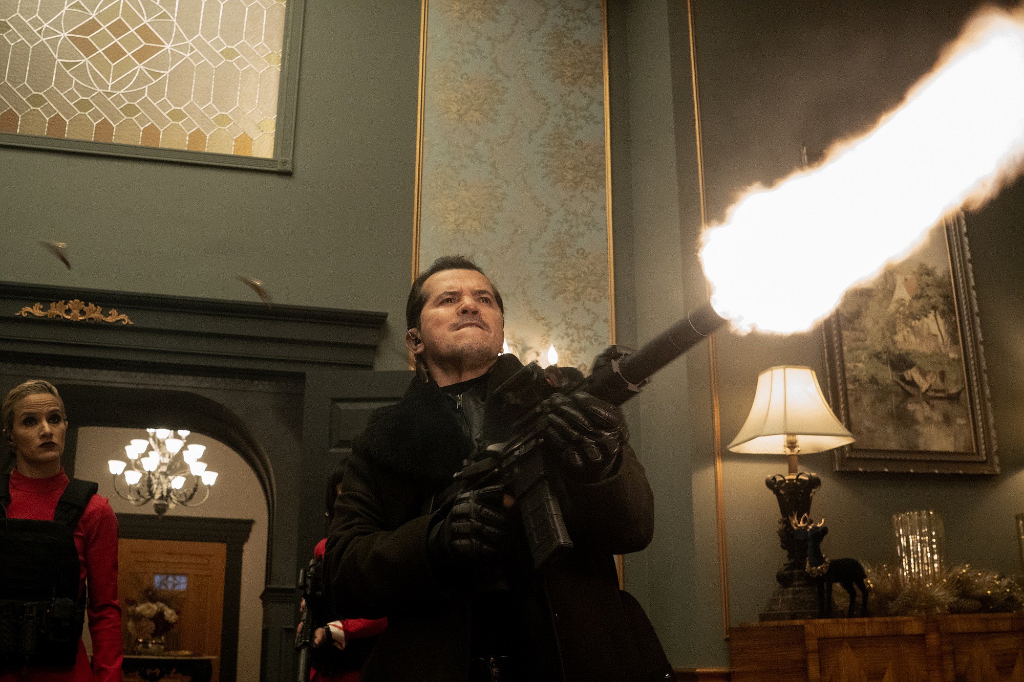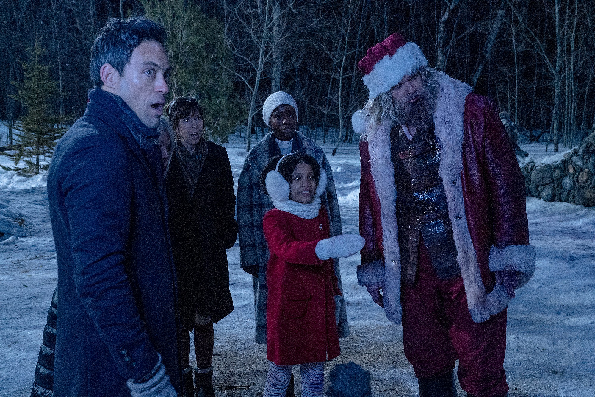 Most of the Lightstone drama, besides the running joke of Alva and Morgan’s son being named Bertrude and Alva and Linda’s bickering while Scrooge’s henchman Krampus (Brendan Fletcher) holds them at gunpoint, is idiotic even when it’s accidentally amusing. There’s a genius moment where Santa is sewing up a gunshot wound and mends it with a piece of gift wrap and a ribbon. Violent Night can be laugh out loud funny solely for how stupid it is.