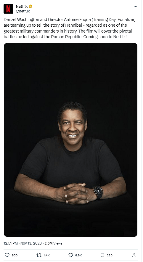 On social media, Netflix also posted, “Denzel Washington and Director Antoine Fuqua (Training Day, Equalizer) are teaming up to tell the story of Hannibal – regarded as one of the greatest military commanders in history. The film will cover the pivotal battles he led against the Roman Republic. Coming soon to Netflix!”