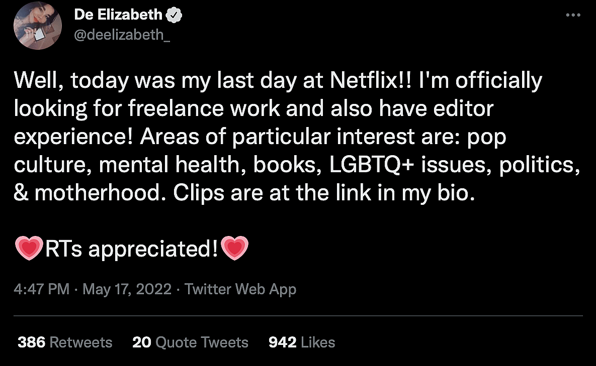 “Well, today was my last day at Netflix!!” stated Tudum writer De Elizabeth. “I’m officially looking for freelance work and also have editor experience! Areas of particular interest are: pop culture, mental health, books, LGBTQ+ issues, politics, & motherhood.”