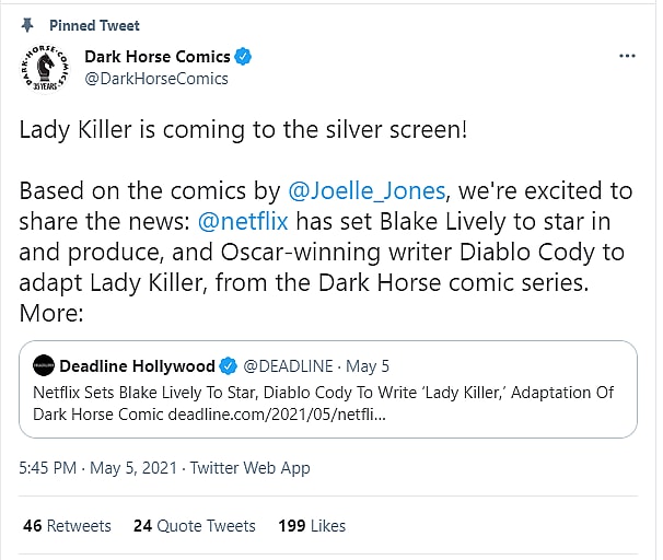 “Based on the comics by Joelle Jones, we’re excited to share the news: Netflix has set Blake Lively to star in and produce, and Oscar-winning writer Diablo Cody to adapt Lady Killer, from the Dark Horse comic series,” they added.