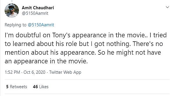 Chaudhari addressed this rumor stating, “I’m doubtful on Tony’s appearance in the movie.. I tried to learned about his role but I got nothing.”