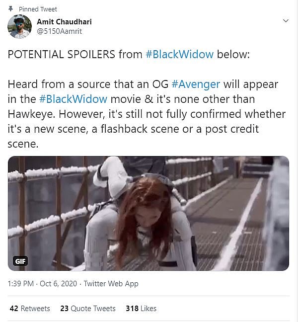 Chaudhari claims that he “heard from a source that an OG Avenger will appear in the Black Widow movie & it’s none other than Hawkeye.”
