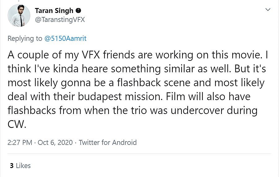 Another Twitter user Taran Singh, who claims he has VFX friends working on the movie, indicated Chaudhari’s claim has validity. Singh wrote, “A couple of my VFX friends are working on this movie. I think I’ve kinda heare something similar as well. But it’s most likely gonna be a flashback scene and most likely deal with their budapest mission.”